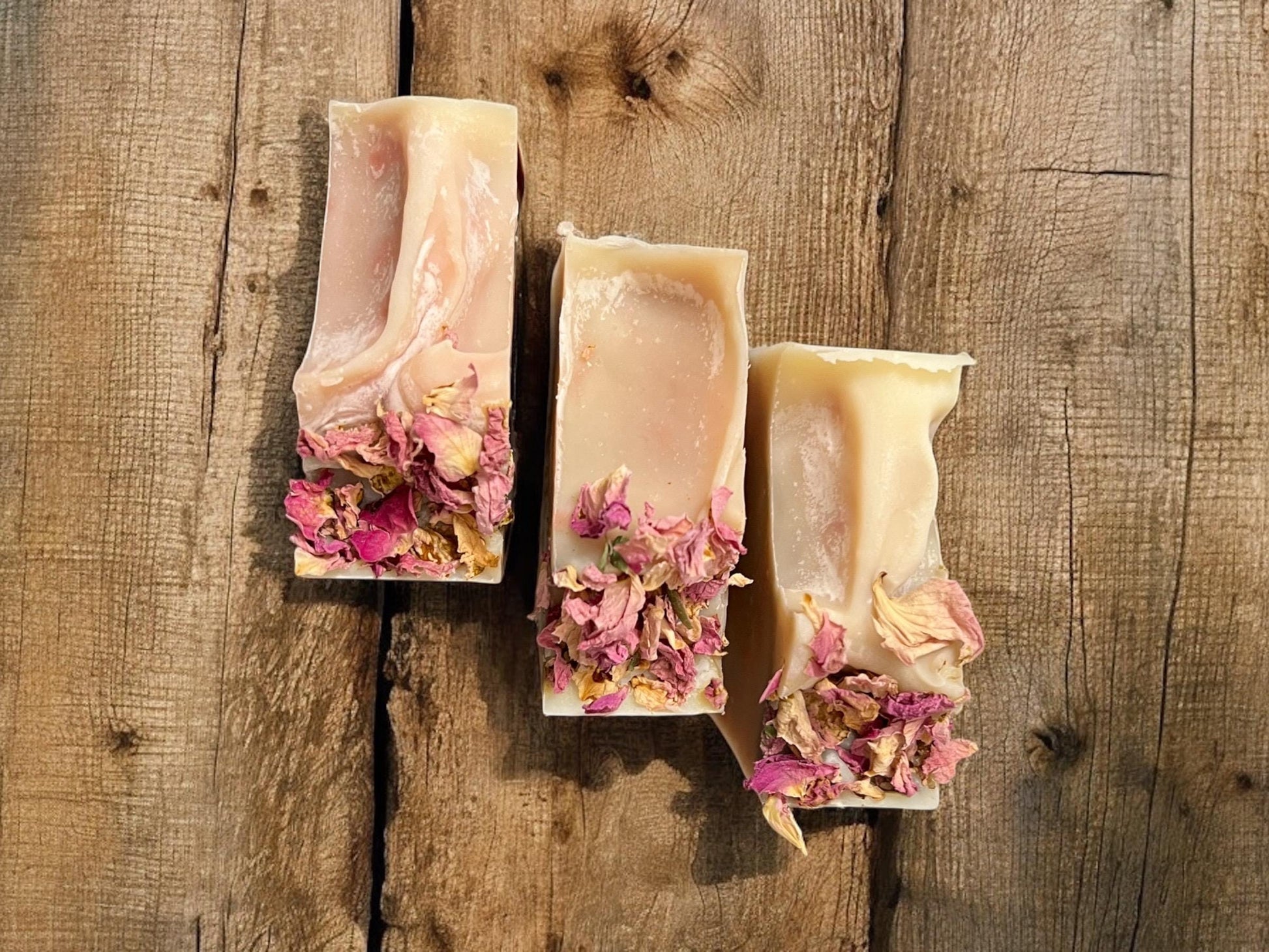 Made with Organic Coconut Oil, olive oil, cocoa butter, mango butter, Castor Oil, lye, water, orange, litsea cubeba, lemon, lime and grapefruit essential oils, kaolin white clay powder, rose clay powder, Serbian blue clay powder, dried flowers.